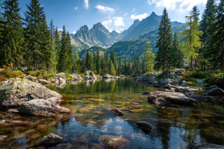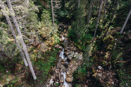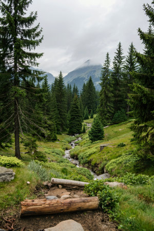 Cold shallow stream winding through majestic pine trees of Tatra mountain range near Zakopane, Poland. Beautiful Low Tatras alpine landscape with forest in the foreground
