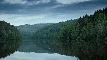 Fog over a lake with reflection from the trees on the water in the bavarian forest