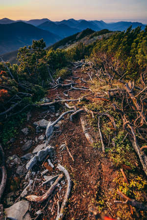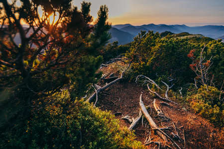 Fantastic sunset landscape with mountain road in pine tree forest. Travel background. Holiday, hiking, sport, recreation. Retro vintage toning effect. Autumn season