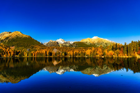 Picturesque autumn view of lake Strbske pleso in High Tatras National Park, Slovakia. Clear water with reflections of orange larch and high mountains on background. Landscape photography