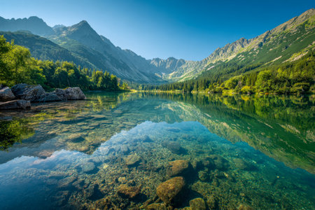 View on lake. Peaceful mountain lake in National Park High Tatra.