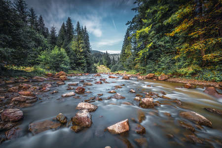 A magnificent landscape of a beautiful mountain river flows down, powerful water stream between boulders. Carpathian mountains. Ukraine.