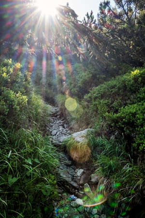 Footpath in coniferous forest, High Tatras mountains, Slovak republic. Hiking theme. Seasonal natural scene.