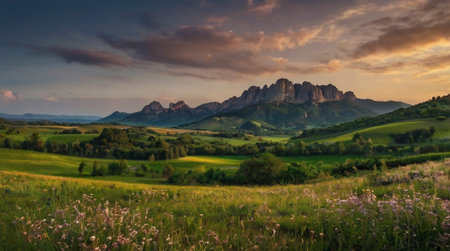 panoramic view of meadow and mountains at sunset. Bavaria, Germany