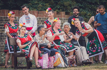 Rochester, England - July 2018 : A group of performers dressed in traditional folk costumes during cultural and folklore festival