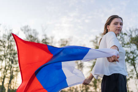 A woman runs with the Russian flag in her hands. The symbol of Russia waving beautifully in the hands of a woman