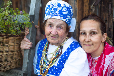 Elderly and young women in ethnic clothes, outdoor in the countryside.