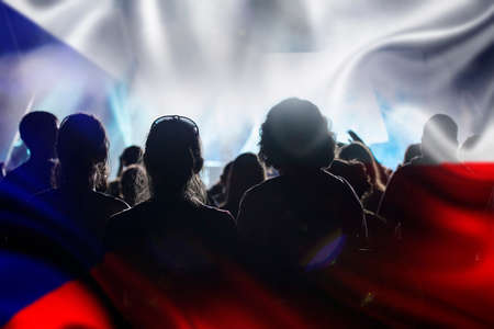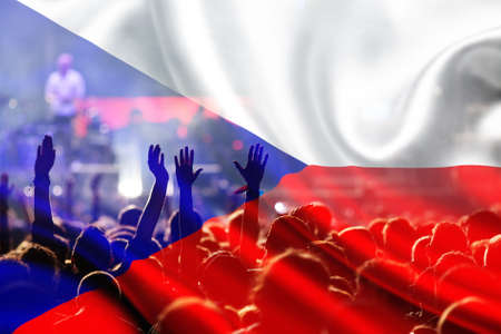 football fans supporting Czech Republic - crowd celebrating in stadium with raised hands against Czech Republic flag