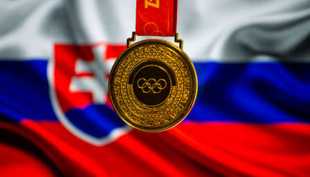 January 5, 2021, Beijing China. Gold medal of the XXIV Olympic Winter Games against the background of the flag of Slovakia.