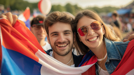 Cheerful young couple waving flags of France and looking at camera. Football concept. Concept of 2024 UEFA European Football Championship
