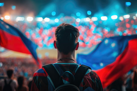 Football fans supporting Czech Republic- crowd celebrating in stadium with raised hands against Czech Republic flag