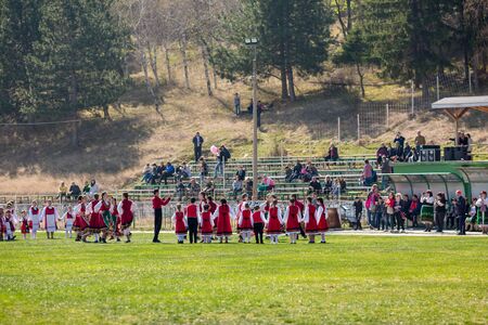 VARVARA, BULGARIA - MARCH 24, 2019: Moment from National Festival Dervish Varvara presents traditions of Bulgarian Kuker Games. Children folklore dancer group performs on stadium where event is held