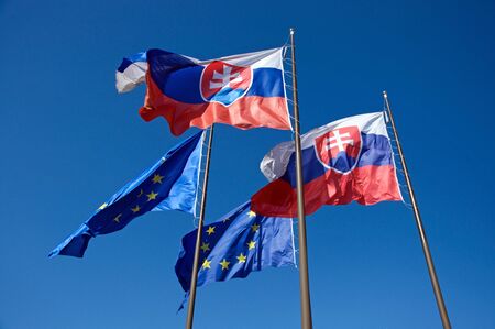 Photo of flags of Slovakia and European Union waving on wind