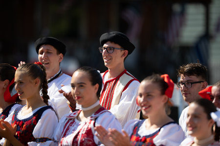 Whiting, Indiana, USA - July 27, 2019: Pierogi Fest, Slovakian dancers, wearing traditional clothing, waiting for their turn to dance