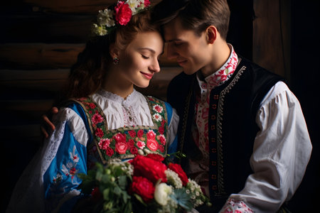 Details with the traditional Romanian clothing of a young woman and man.