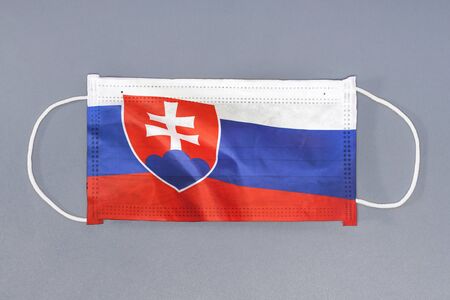 Isolated medical mask with flag of Slovakia on gray background. Closeup protective masks textile filter. Health care and medical concept. Coronavirus, virus in Slovakia.