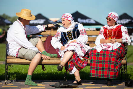08/29/2020 Belarus, Lyaskovichi. Celebration in the city. People in national Slavic clothes are sitting on the bench. Belarusians or ukran man and women.