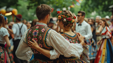 Traditional folk dancers in colorful costumes, performing at a cultural festival, celebrating heritage and community