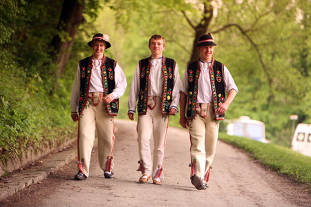 Regional, folklore costumes, colorful handmade shirts with stripes and symbols embroidered. During Corpus Christi parade.
