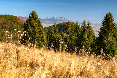 Autumn country and forest. High tatras mountains at bacground. Slovakia