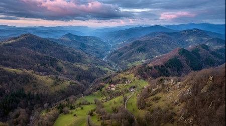 Fresh greenery covers hills during spring. A pastel sky highlights the landscape. Mountains and valleys create a beautiful view in the distance.