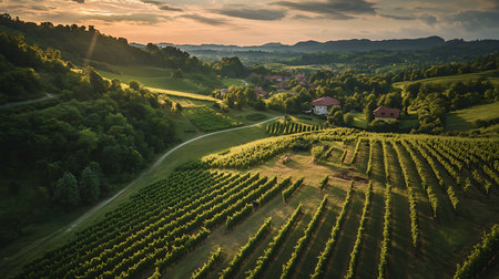 Aerial view of vineyard in the countryside of Slovenia at sunset