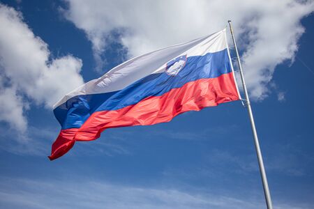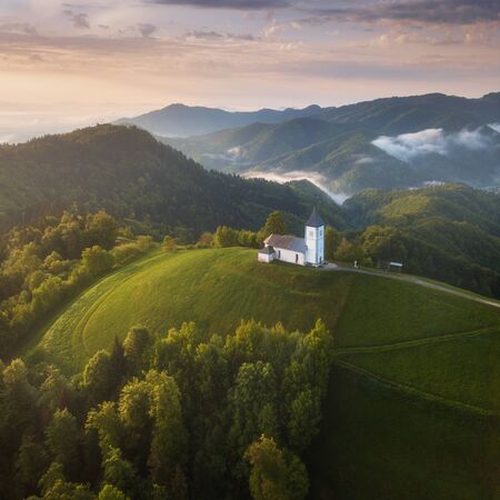 Aerial view of St. Jamnik, Slovenia Primoz in Slovenia near Jamnik with beautiful clouds and Julian Alps at background. Tourist places of pilgrimage. Spring or summer time.