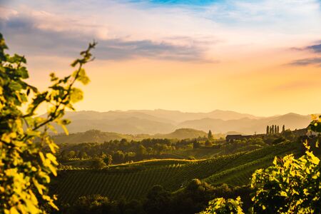 Sunset over South Styria vineyard landscape in Steiermark, Austria. Beautiful tranquil destination to visit for famous white wine. Tra