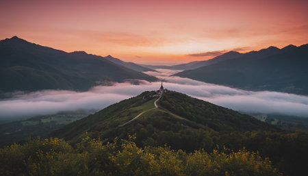 Beautiful sunrise in the mountains with fog and church in the foreground