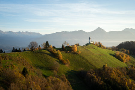 The Church of St. Tomaz (St. Thomas) on top of a hill at a beautiful sunrise in the fall, near Skofja Loka in the Upper Carniola region of Slovenia.