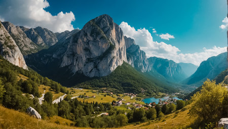 Panoramic view of a beautiful alpine lake with mountains in the background