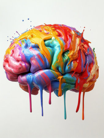 A brain is vividly decorated with colorful paint strokes and splashes, symbolizing creativity and dynamic thought processes.