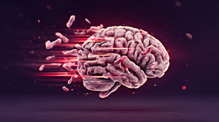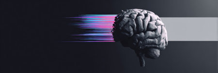 A glitchy image of a fractured brain against a dark gradient highlights the complexity of thought and perception.