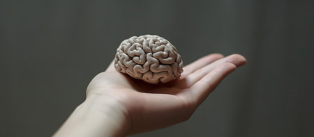 Realistic anatomical model of a human brain resting on a flowering cherry blossom branch symbolizes mental health and blossoming ideas. Generative ai