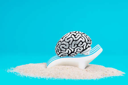 Anatomical copy of a human brain lying on a sunbed on a sandy beach. Taking a break for a healthy mindset.