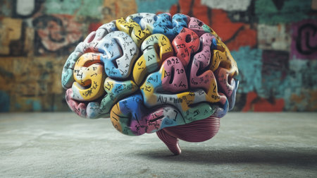 A vibrant brain sculpture with colorful sections features various mathematical equations, set against a textured urban backdrop in a creative studio environment