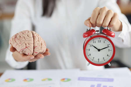 This conceptual artwork combines a human brain with a clock, representing the interplay between time, memory, and consciousness in our lives.