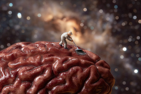 A surreal tiny figure meticulously cleans a giant brain with a broom, set against a backdrop of a vibrant nebula, representing focus, hygiene, and cognitive function.