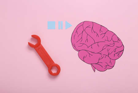 mental health concept. Wrench with brain, icons start, stop, pause of media player on pink background. top view