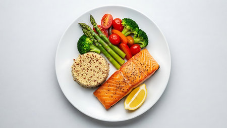 Healthy meal with grilled salmon, asparagus, cherry tomatoes and lemon
