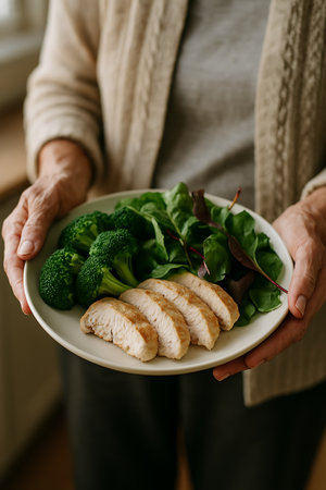An older woman holds a plate with lean sliced chicken breast, broccoli, and fresh green salad.