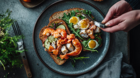 A beautiful gourmet open sandwich combines tender shrimp, fresh cucumbers, vibrant herbs, and delicate quail eggs, ideal for upscale dining experiences.