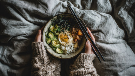 A top-down shot showcases a bowl filled with various food items, including vegetables and an egg, held by a person. The scene features warm tones, with the bowl resting on a textured surface. The composition suggests an intimate, inviting atmosphere, potentially suitable for editorial content or food-related marketing.