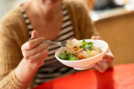 Asian woman eat Taiwanese Meatballs at a store