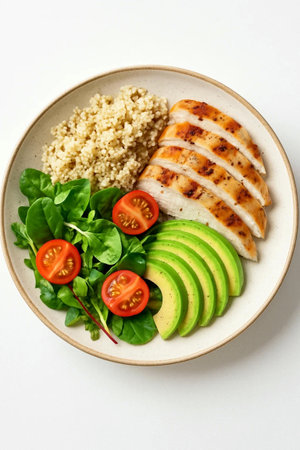 Plate of healthy salad with quinoa and chicken breast on white background