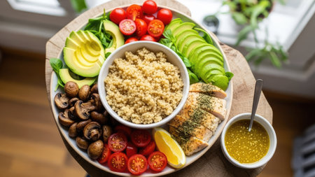 Healthy lunch bowl with quinoa, avocado, cherry tomatoes and mushrooms
