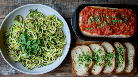 Zucchini spaghetti with zucchini pesto sauce and bread