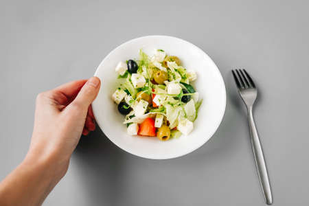 Greek salad on gray background. Front view.