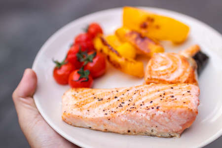 Hand holding plate of salmon fillet steak with cherry tomatoes and bell pepper.