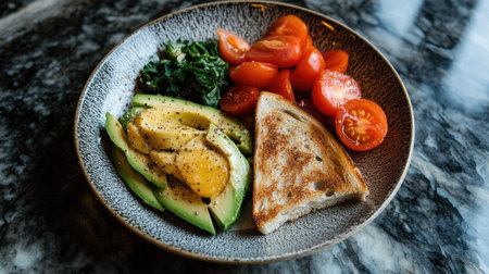a plate filled with sliced avocado, whole grain toast, and fresh tomatoes, arranged in a balanced, healthy meal --chaos 30 --ar 16:9 --v 6.1 Job ID: 4a366d19-3241-4877-bf7f-47e20f5c69fb